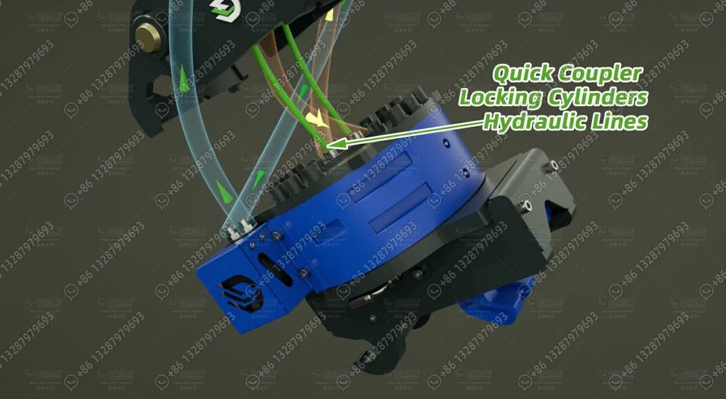 В нижней части быстросменного адаптера расположены два масляных патрубка, которые свободно вращаются вместе с быстросменным блоком. Просто подсоедините масляную магистраль вашего навесного оборудования к этим двум нижним масляным патрубкам.